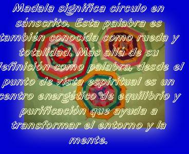 Mandala significa círculo en sánscrito. Esta palabra es también conocida como rueda y totalidad. Más allá de su definición como palabra, desde el punto de vista espiritual es un centro energético de equilibrio y purificación que ayuda a transformar el entorno y la mente. También se le define como un sistema ideográfico contenedor de un espacio sagrado.